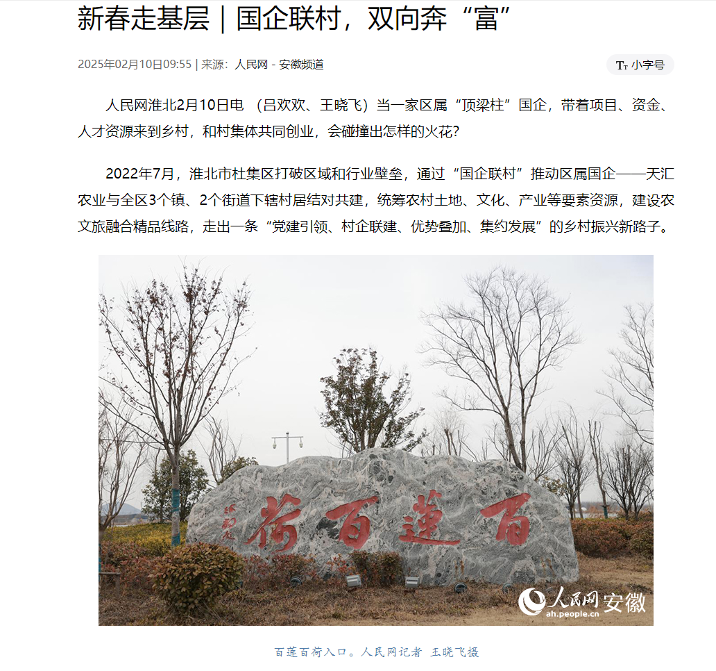12 02月2025 了解詳情 《天匯農(nóng)業(yè):新春受贊,新年連獲佳績(jī)》 在杜集區(qū)的鄉(xiāng)村振興實(shí)踐中,在集團(tuán)公司的戰(zhàn)略引領(lǐng)與資源支持下,與鄉(xiāng)村緊密攜手,天匯農(nóng)業(yè)與全區(qū)3個(gè)鎮(zhèn)、2個(gè)街道下轄村居結(jié)對(duì)共建,統(tǒng)籌農(nóng)村土地、文化、產(chǎn)業(yè)等要素資源,建設(shè)農(nóng)文旅融合精品線路,走出了一條獨(dú)具特色的發(fā)展之路, 近日,人民網(wǎng)在新春走基層系列報(bào)道中,聚焦淮北市杜集區(qū)的“國(guó)企聯(lián)村”模式,對(duì)淮北市天匯農(nóng)業(yè)發(fā)展有限公司進(jìn)行了重點(diǎn)報(bào)道。