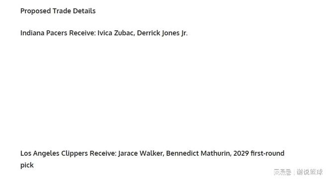 媒體FW就腦洞大開,支招快船跟步行者進行交易,可以兜售中鋒祖巴茨再加上扣將小德里克-瓊斯。而從具體方案來看,快船換取兩名替補賈里斯-沃克、馬瑟林再加上一個2029年的首輪選秀簽位。